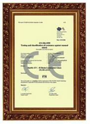歐洲標(biāo)準(zhǔn)EN 356 (P6B、P7B)模擬入室行 竊測(cè)試試用超銳夾膠UV-H型制成夾層玻璃的抗擊性能,用機(jī)械斧頭均勻砍擊夾層玻璃次數(shù)分別為31-50次和51-70次。兩種標(biāo)準(zhǔn)所能達(dá)到防盜竊和破門安全性能的不同級(jí)別的防護(hù)標(biāo)準(zhǔn)。(中國GB9962-1999國家標(biāo)準(zhǔn)沒有歐洲標(biāo)準(zhǔn)機(jī)械斧頭抗防盜的打擊標(biāo)準(zhǔn))。